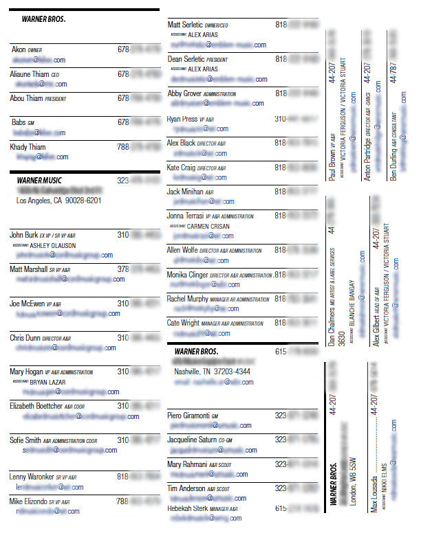 Email Addresses and Phone Numbers for Execs at Warner Bros. Records